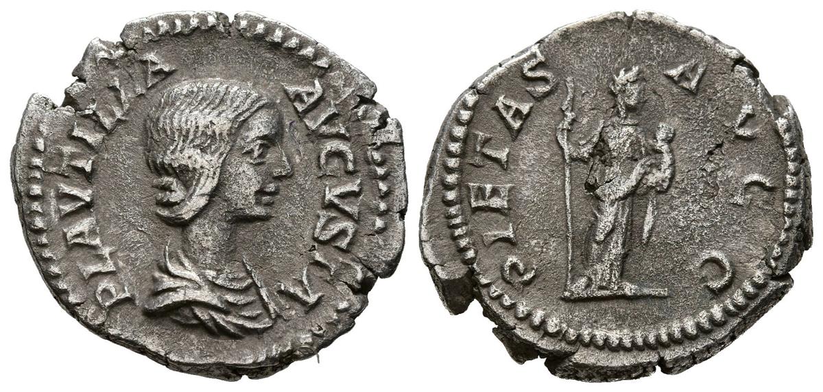 PLAUTILLA. Denario. (Ar. 2,77g/19mm). 202-203 d.C. Roma. (RIC 367). Anv: Busto drapeado de Plautilla a derecha, alrededor leyenda: PLAVTILLA AVGVSTA. Rev: Pietas estante a derecha portando cetro y con niño en brazos, alrededor leyenda: PIETAS AVGG. MBC.