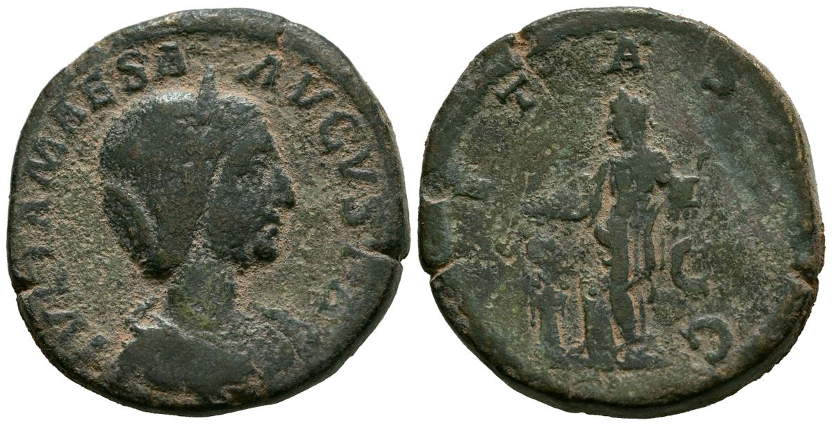 JULIA MAESA. Sestercio. (Ae. 27,27g/30mm). 218-220 d.C. Roma. (RIC 414). Anv: Busto diademado y drapeado de Julia Maesa a derecha, alrededor leyenda: IVLIA MAESA AVGVSTA. Rev: Pietas estante a izquierda portando patera sobre altar, entre SC, alrededor leyenda: PIETAS AVG. MBC-.