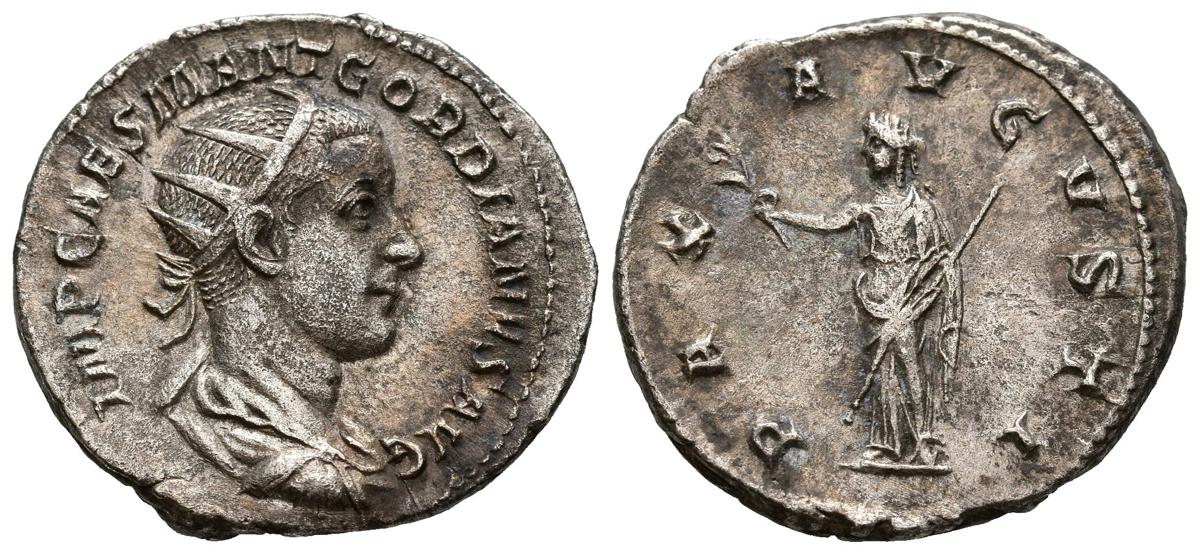 GORDIANO III. Antoniniano. (Ar. 4,25g/22mm). 238-239 d.C. Roma. (RIC 3). Anv: Busto radiado y drapeado de Gordiano III a derecha, alrededor leyenda: IMP CAES M ANT GORDIANVS AVG. Rev: Pax estante a izquierda portando cetro y palma, alrededor leyenda: PAX AVGVSTI. MBC+.