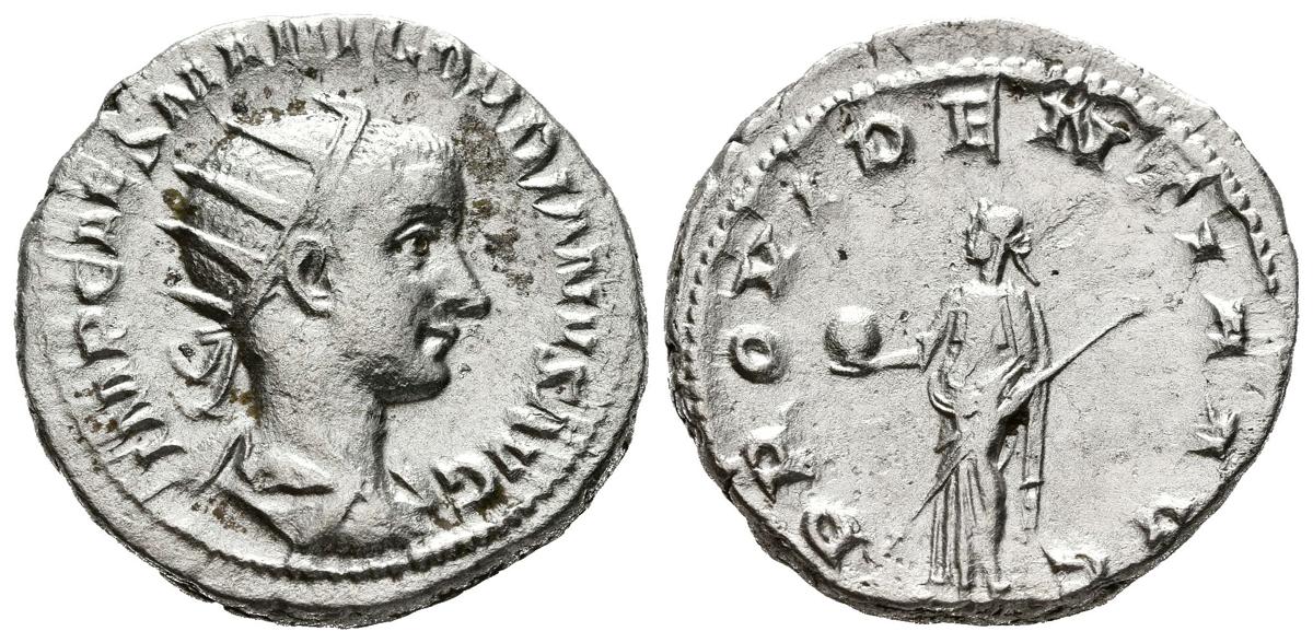 GORDIANO III. Antoniniano. (Ar. 3,84g/21mm). 238-244 d.C. Roma. (RIC 4). Anv: Busto radiado y drapeado de Gordiano III a derecha, alrededor leyenda: IMP CAES M ANT GORDIANVS AVG. Rev: Providentia estante a izquierda portando globo y cetro, alrededor leyenda: PROVIDENTIA AVG. MBC-. Limpiado.