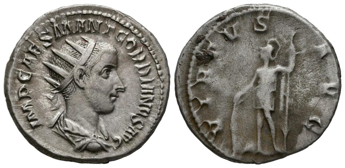 GORDIANO III. Antoniniano. (Ar. 4,93g/22mm). 239 d.C. Roma. (RIC 39). Anv: Busto radiado y drapeado a derecha, alrededor leyenda: IMP CAES M ANT GORDIANVS AVG. Rev: Virtus estante a izquierda portando escudo y lanza, alrededor leyenda: VIRTVS AVG. MBC+/MBC.