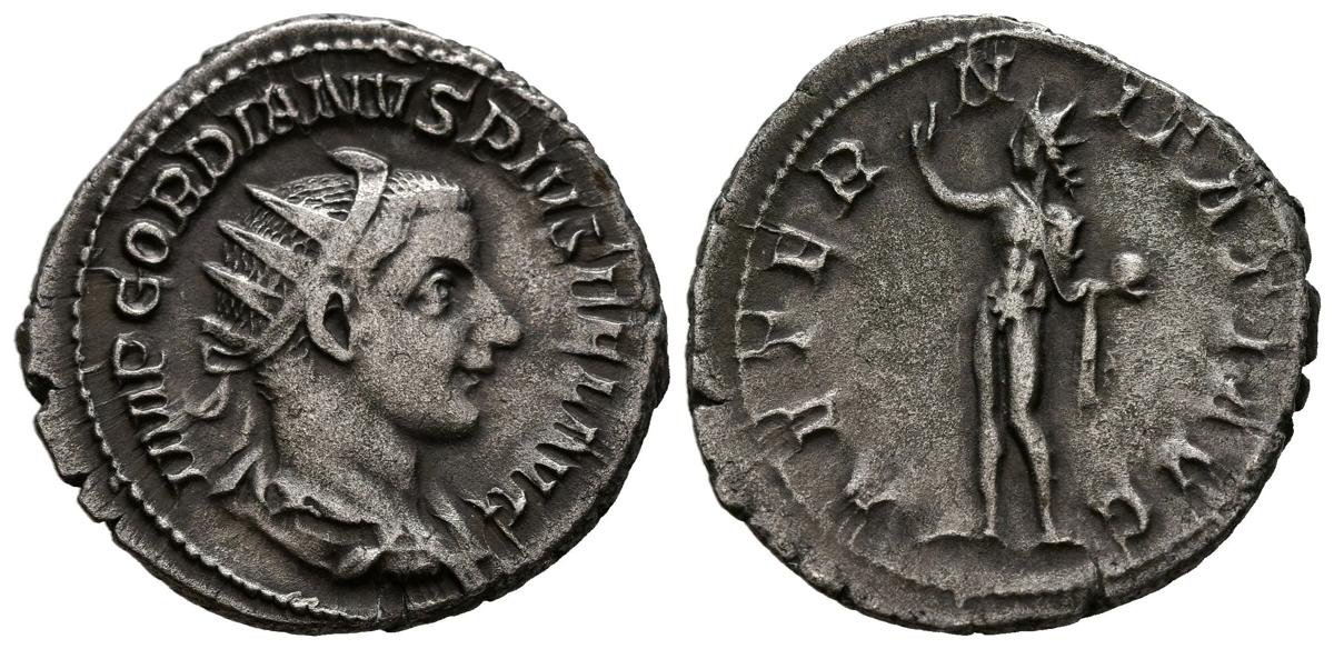 GORDIANO III. Antoniniano. (Ar. 4,15g/22mm). 240-244 d.C. Roma. (RIC 82). Anv: Busto radiado y drapeado de Gordiano III a derecha, alrededor leyenda: IMP GORDIANVS PIVS FEL AVG. Rev: Sol radiado estante a izquierda portan globo y alzando mano derecha, alrededor leyenda: AETERNITATI AVG. MBC.