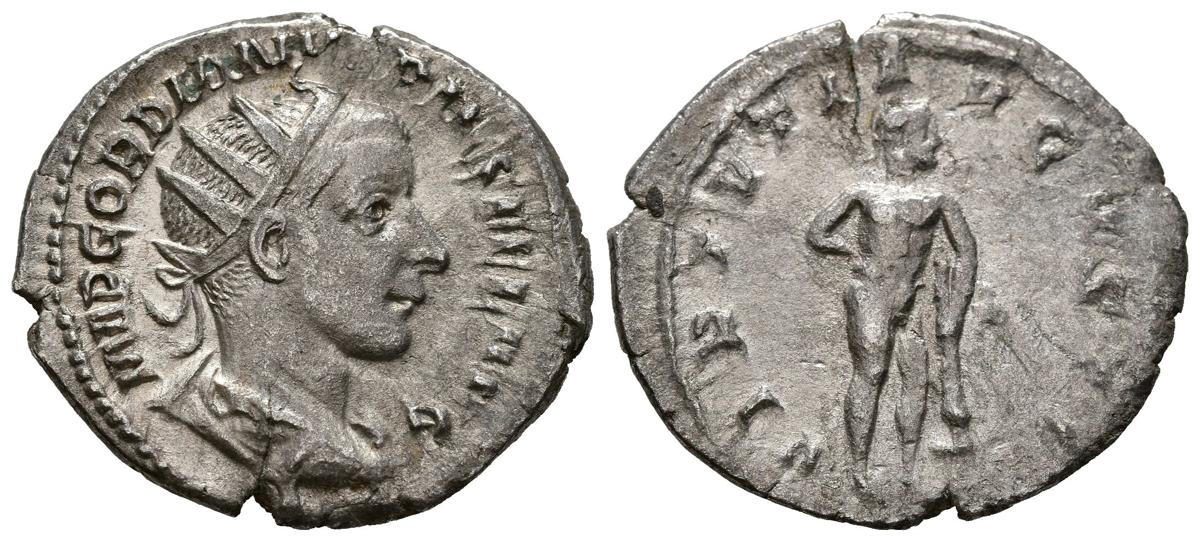 GORDIANO III. Antoniniano. (Ar. 2,92g/23mm). 241-243 d.C. Roma. (RIC 95). Anv: Busto radiado, drapeado y con coraza de Gordiano III a derecha, alrededor leyenda: IMP GORDIANVS PIVS FEL AVG. Rev: Hércules estante a derecha apoyado sobre club, alrededor leyenda: VIRTVTI AVGVSTI. MBC/MBC-.