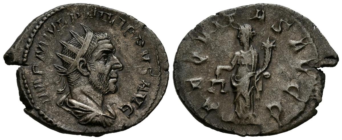 FILIPO I. Antoniniano. (Ar. 3,93g/25mm). 245-247 d.C. Roma. (RIC 27b). Anv: Busto radiado y drapeado de Filipo I a derecha, alrededor leyenda: IMP M IVL PHILIPPVS AVG. Rev: Aequitas estante a izquierda portando escalas y cornucopia, alrededor leyenda: AEQVITAS AVGG. MBC+/MBC.