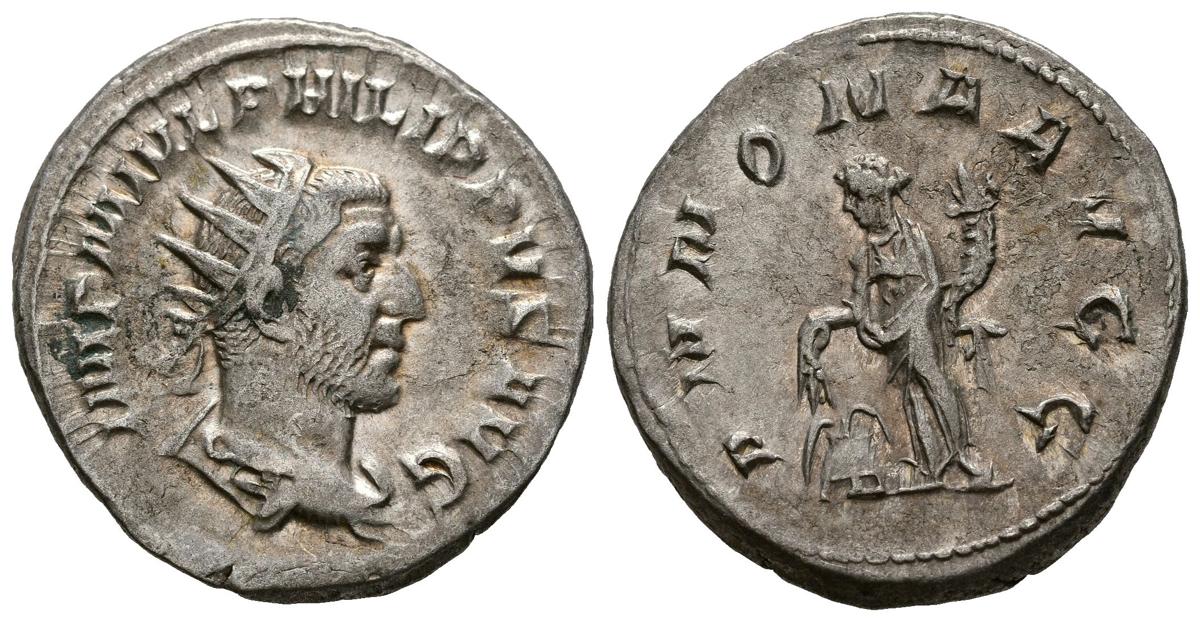 FILIPO I. Antoniniano. (Ar. 4,85g/23mm). 247 d.C. Roma. (RIC 28c). Anv: Busto radiado y drapeado de Filipo I a derecha, alrededor leyenda: IMP M IVL PHILIPPVS AVG. Rev: Annona estante a izquierda portando espiga sobre modio y cornucopia, alrededor leyenda: ANNONA AVG. MBC.