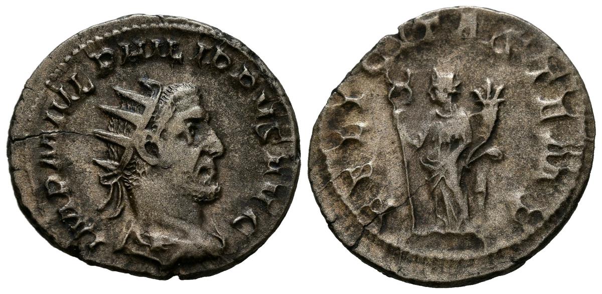 FILIPO I. Antoniniano. (Ar. 3,76g/23mm). 244-247 d.C. Roma. (RIC 31). Anv: Busto radiado y drapeado de Filipo I a derecha, alrededor leyenda: IMP M IVL PHILIPPVS AVG. Rev: Felicitas estante a izquierda portando caduceo y cornucopia, alrededor leyenda: FELICITAS TEMP. MBC-. Grieta.