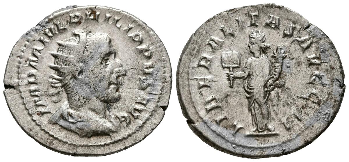 FILIPO I. Antoniniano. (Ar. 4,20g/24mm). 244-247 d.C. Roma. (RIC 38b). Anv: Busto radiado y drapeado de Filipo I a derecha, alrededor leyenda: IMP M IVL PHILIPPVS AVG. Rev: Liberalitas estante a izquierda portando ábaco y cornucopia, alrededor leyenda: LIBERALITAS AVGG II. MBC.