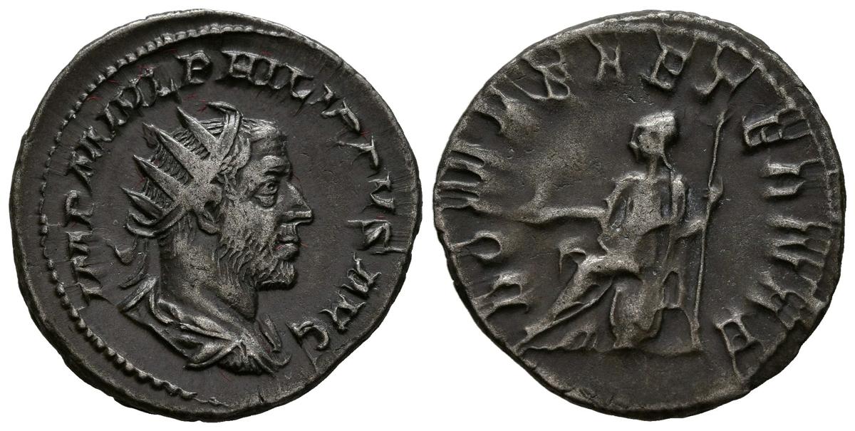 FILIPO I. Antoniniano. (Ar. 3,87g/23mm). 244-247 d.C. Roma. (RIC 44b). Anv: Busto radiado y drapeado de Filipo I a derecha, alrededor leyenda: IMP PHILIPPVS AVG. Rev: Roma sentada a izquierda portando Victoria y cetro, alrededor leyenda: ROMA AETERNAE. MBC.