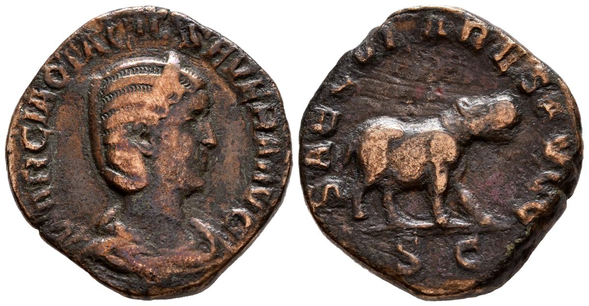 OTACILIA SEVERA. Sestercio. (Ae. 16,62g/28mm). 248 d.C. Roma. (RIC 200a). Anv: Busto diademado y drapeado de Otacilia Severa a derecha, alrededor leyenda: MARCIA OTACIL SEVERA AVG. Rev: Hipopótamo a derecha, debajo: SC, alrededor leyenda: SAECVLARES AVGG. MBC. Escaso ejemplar.