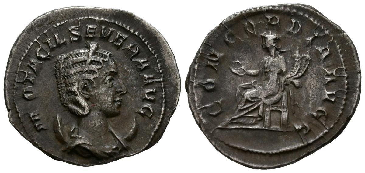 OTACILIA SEVERA. Antoniniano. (Ar. 3,64g/24mm). 247 d.C. Roma. (RIC 125c). Anv: Busto diademado y drapeado de Otacilia Severa a derecha sobre creciente, alrededor leyenda: M OTACIL SEVERA AVG. Rev: Concordia sentada a izquierda portando patera y doble corcucopia, alrededor leyenda: CONCORDIA AVGG. MBC+/MBC.