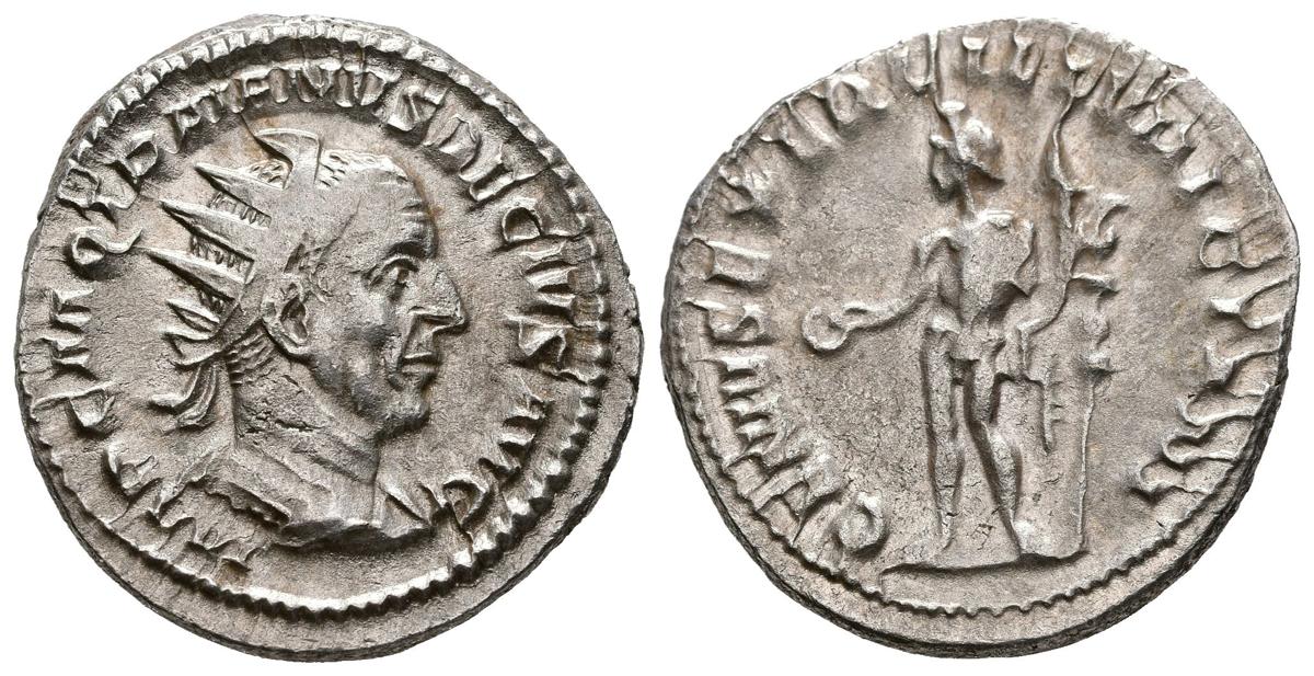 TRAJANO DECIO. Antoniniano. (Ar. 3,95g/22mm). 249-251 d.C. Roma. (RIC 16c). Anv: Busto radiado y drapeado de Trajano Decio a derecha, alrededor leyenda: IMP C M Q TRAIANVS DECIVS AVG. Rev: Genio estante a izquierda portando patera y cornucopia, detrás estandarte, alrededor leyenda: GENIVS EXERC ILLVRICIANI. MBC+.