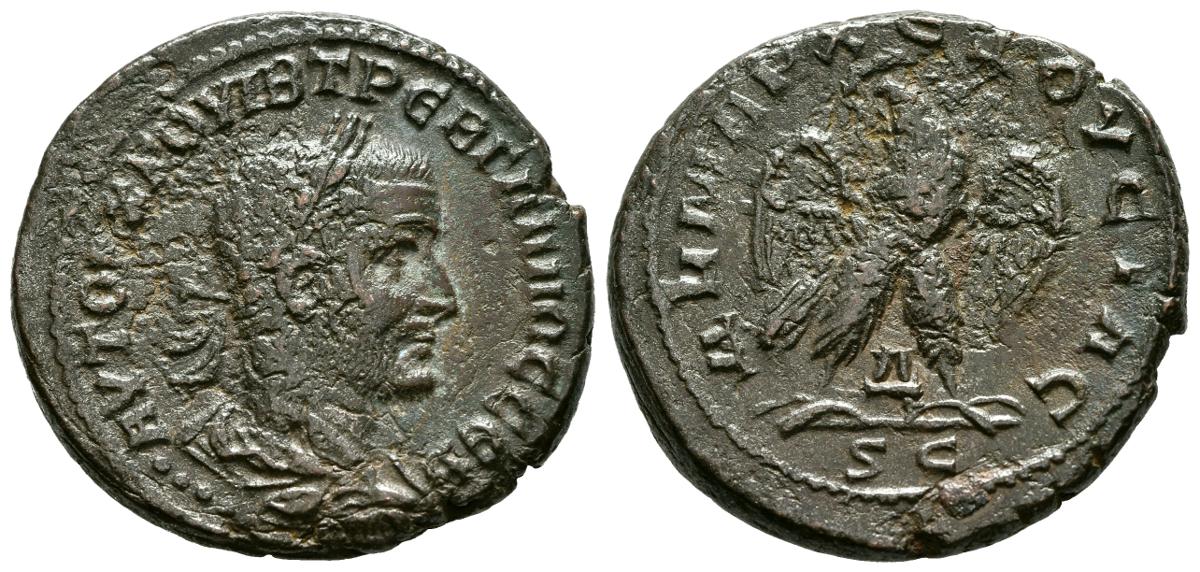 TREBONIANO GALO. Tetradracma. (Ve. 9,93g/27mm). 251 d.C. Antioquía. (Prieur 65). Anv: Busto laureado y drapeado de Treboniano Galo a derecha, alrededor leyenda griega. Rev: Aguila estante a izquierda sobre rayo con corona de laurel en el pico, entre sus patas A, debajo SC, alrededor leyenda griega. MBC-.