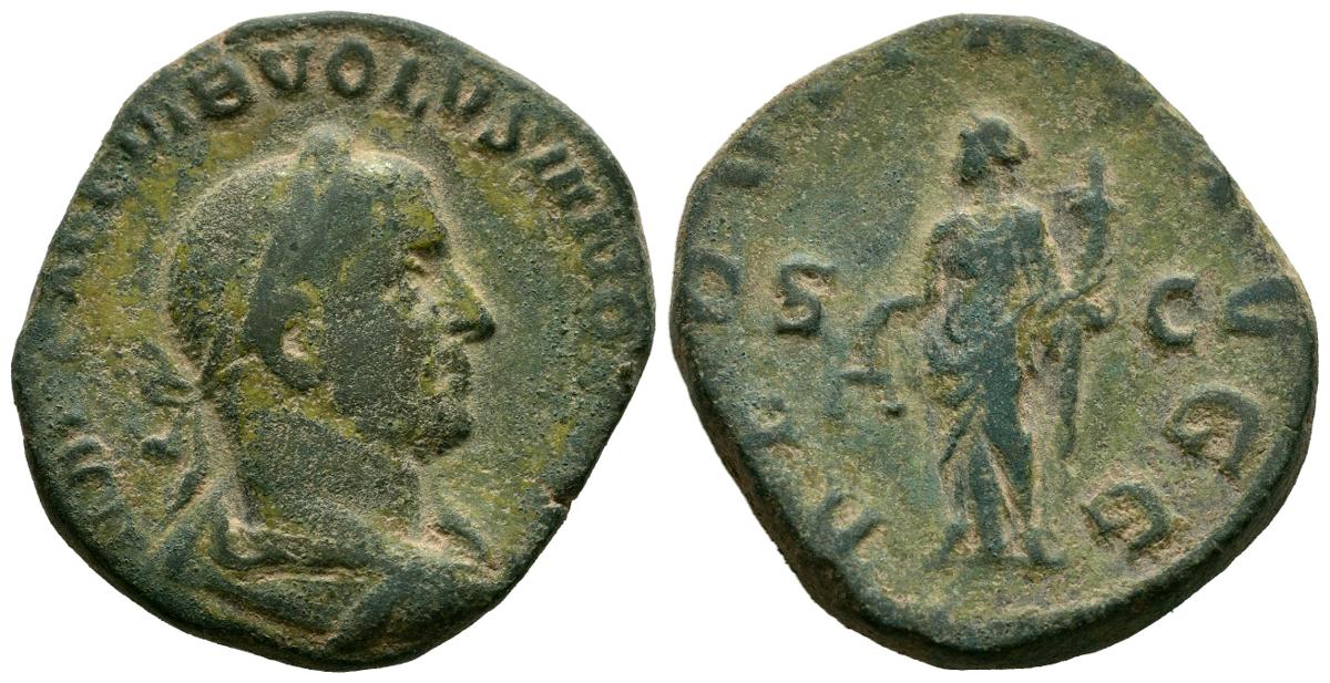 VOLUSIANO. Sestercio. (Ae. 18,34g/28mm). 253 d.C. Roma. (RIC 246). Anv: Busto laureado y drapeado de Volusiano a derecha, alrededor leyenda: IMP CAE C VIB VOLVSIANO AVG. Rev: Aequitas estante a izquierda portando escalas y cornucopia, entre S-C, alrededor leyenda: AEQVITAS AVGG. MBC. Pátina verde.