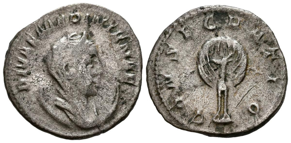 DIVA MARINIANA. Antoniniano. (Ve. 3,23g/22mm). 256 d.C. Roma. (RIC 4). Anv: Busto diademado y drapeado de Mariniana a derecha encima de creciente, alrededor leyenda: DIVAE MARINIANAE. Rev: Pavo real estante de frente mirando a izquierda, alrededor leyenda: CONSECRATIO. MBC. Restos de plateado original.