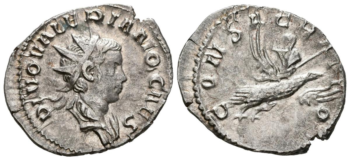 VALERIANO II. Denario. (Ar. 2,77g/23mm). 258 d.C. Lugdunum. (RIC 9). Anv: Busto radiado y drapeado de Valeriano II a derecha, alrededor leyenda: DIVO VALERIANO CAES. Rev: Valeriano II con cetro sobre águila a derecha, alrededor leyenda: CONSECRATIO. EBC-. Bonito ejemplar.