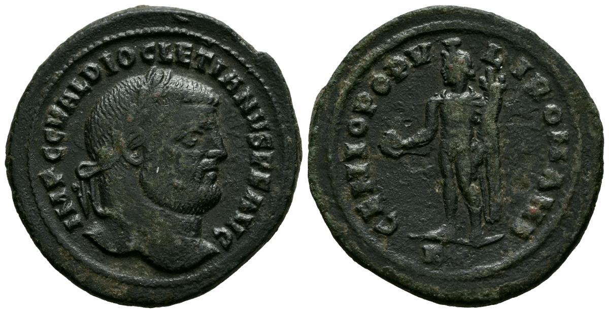 DIOCLECIANO. Follis. (Ae. 9,13g/30mm). 295-196 d.C. Cícico. (RIC 12a). Anv: Busto laureado de Diocleciano a derecha, alrededor leyenda: IMP C C VAL DIOCLETIANVS P F AVG. Rev: Genio estante a izquierda portando patera y cornucopia, en exergo: Kr, alrededor leyenda: GENIO POPVLI ROMANI. MBC.