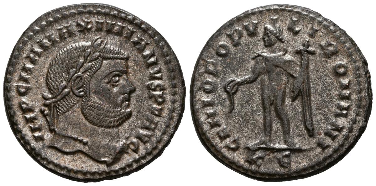 MAXIMIANO. Follis. (Ae. 10,27g/27mm). 295-296 d.C. Cícico. (RIC 10b). Anv: Cabeza laureada de Maximiano a derecha, alrededor leyenda: IMP C M A MAXIMIANVS P F AVG. Rev: Genio estante a izquierda portando patera y cornucopia, en exergo: KE, alrededor leyenda: GENIO POPVLI ROMANI. EBC+/EBC. Restos de plateado original.