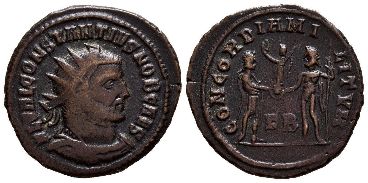 CONSTANCIO I. Antoniniano. (Ae. 3,34g/22mm). 296-299 d.C. Cícico. (RIC 19a). Anv: Busto radiado y con coraza de Constancio I a derecha, alrededor leyenda: FL VAL CONSTANTIVS NOB CAES. Rev: Constancio I recibiendo Victoria con corona de laurel de Júpiter, entre ellos: KB, alrededor leyenda: CONCORDIA MILITVM. MBC.