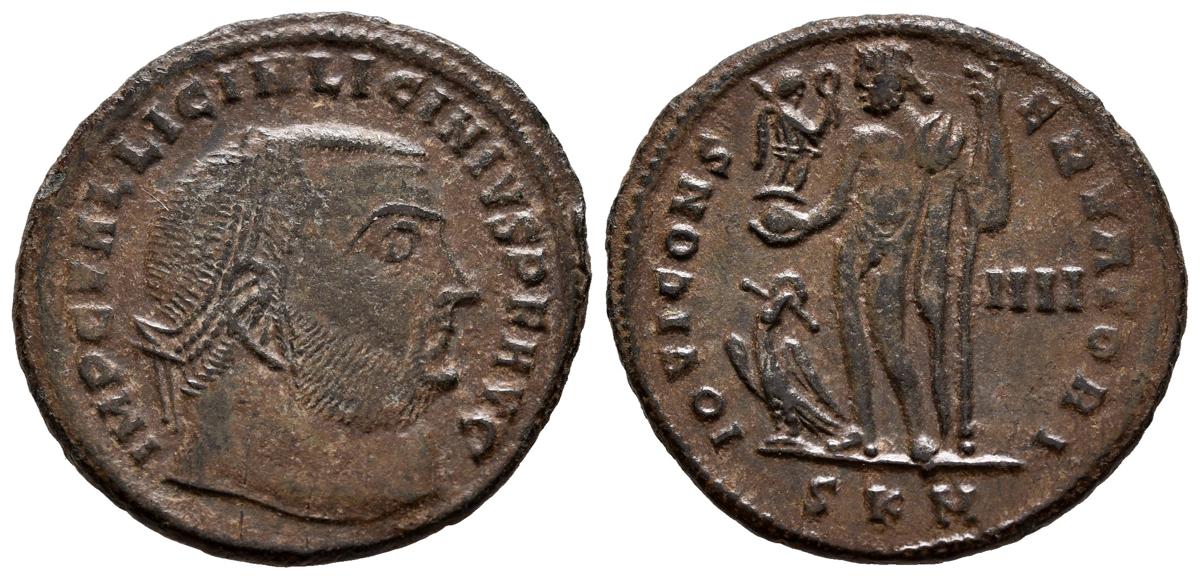 LICINIO I. Follis. (Ae. 4,22g/23mm). 316-317 d.C. Cícico. (RIC 6). Anv: Cabeza laureada de Licino I a derecha, alrededor leyenda: IMP C VAL LICIN LICINIVS P F AVG. Rev: Júpiter estante a izquierda portando Victoria con corona de laurel y cetro, a sus pies águila con corona de laurel, en campo: IIII, en exergo: SKM, alrededor leyenda: IOVI CONSERVATORI. MBC.