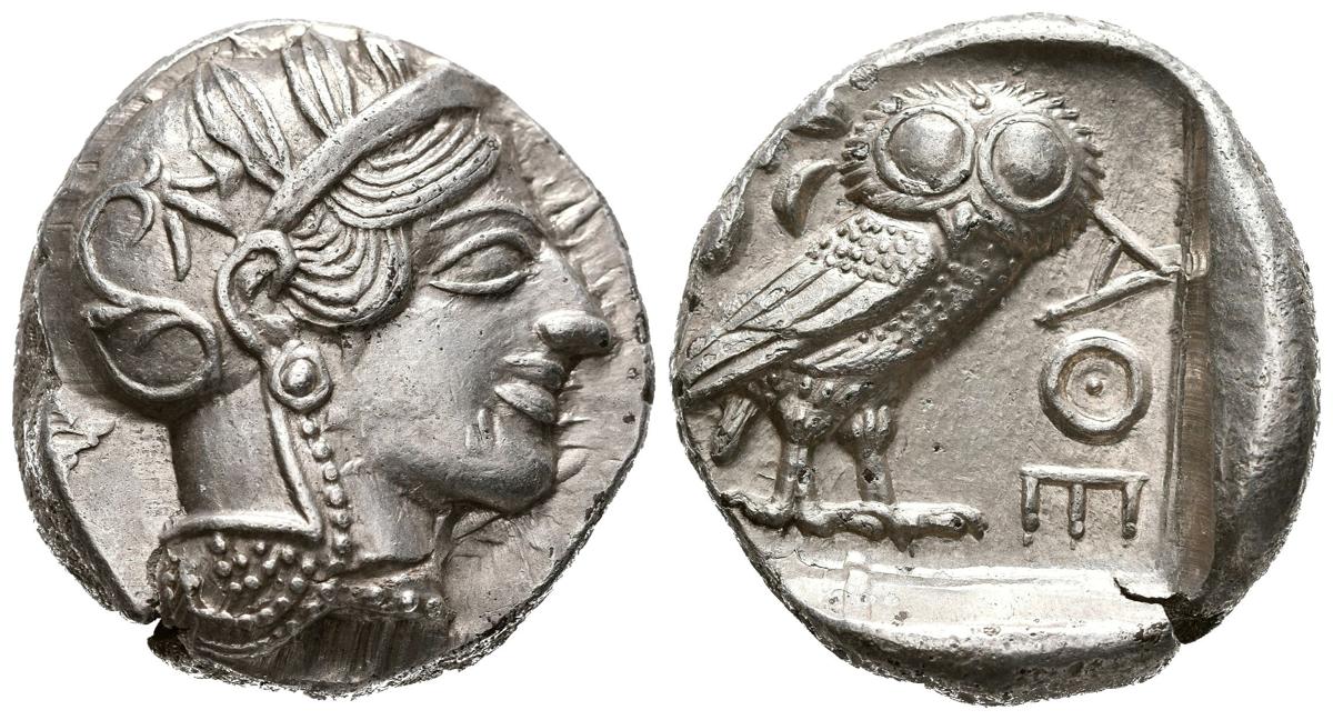ATTICA, Atenas. Tetradracma. (Ar. 17,19g/25mm). 454-404 a.C. (SNG Copenhagen 31). Anv: Cabeza de Atenas con casco ático con cresta a derecha. Rev: Búho estante a derecha mirando de frente, delante: AOE, detrás rama de olivo. EBC. Precioso ejemplar, escaso así.
