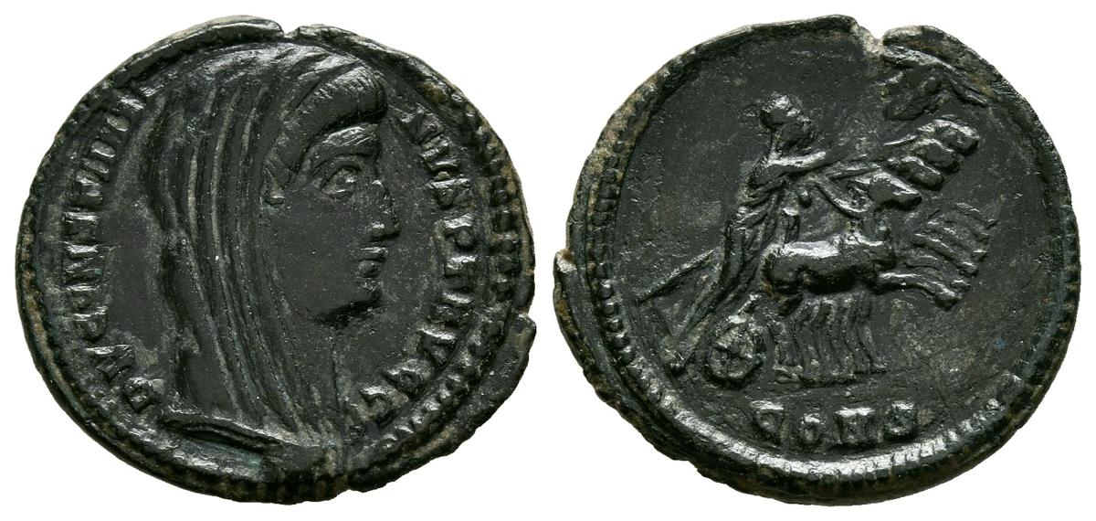 CONSTANTINO I. Follis. (Ae. 1,73g/17mm). 337 d.C. Constantinopla. (RIC 37). Anv: Busto velado de Constantino I a derecha, alrededor leyenda: DN CONSTANTINVS PF AVGG. Rev: Constantino I conduciendo cuádriga a derecha, en exergo: CONS. MBC+.