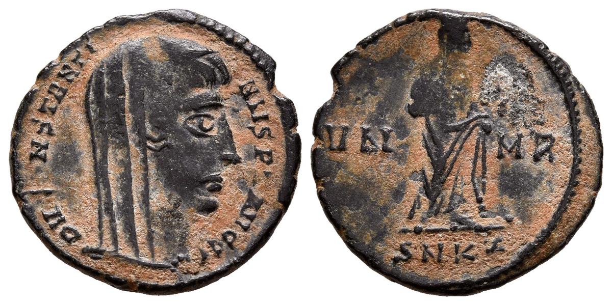 CONSTANTINO I. Follis. (Ae. 1,39g/16mm). 307-337 d.C. Cícico. (RIC 46). Anv: Busto velado a derecha, alrededor leyenda: DN CONSTANTINVS PT AVGG. Rev: Constantino velado de frente, entre: VN-MR, en exergo: SMKA. MBC.