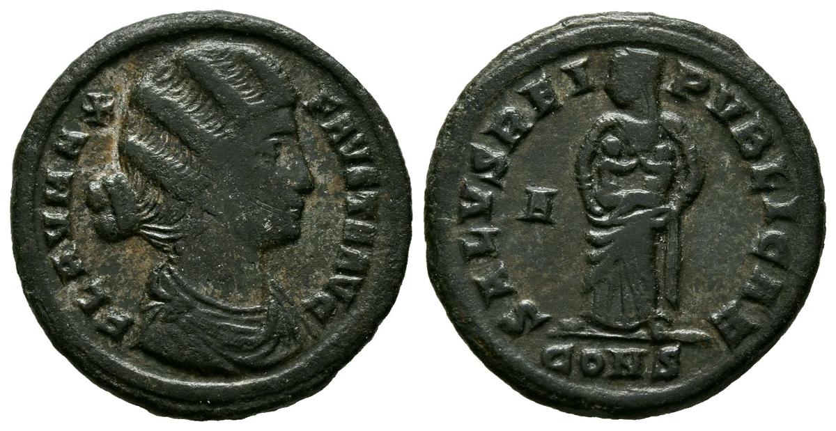 FAUSTA. Follis. (Ae. 3,16g/19mm). 326 d.C. Constantinopla. (RIC 12). Anv: Busto drapeado de Fausta a derecha, alrededor leyenda: FLAV MAC FAVSTA AVG. Rev: Salus estante a izquierda portando dos niños, en campo: A, en exergo: CONS, alrededor leyenda: SALVS REI PVBLICAE. EBC-.