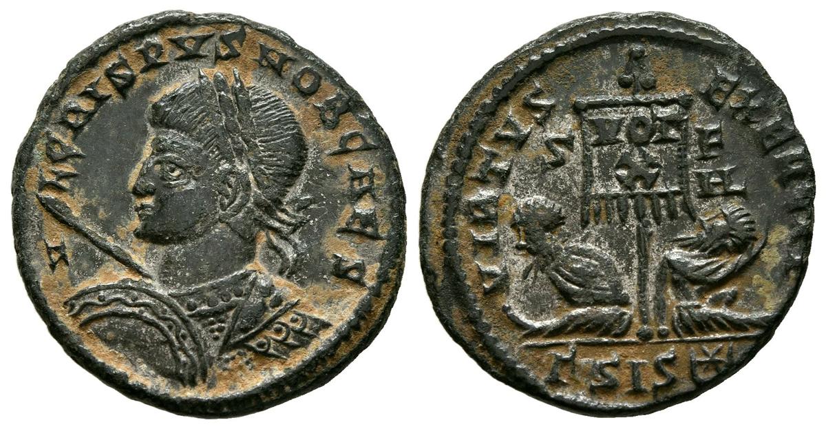 CRISPO. Follis. (Ae. 2,90g/19mm). 320 d.C. Siscia. (RIC 130). Anv: Busto laureado con coraza de Crispo a izquierda portando lanza y escudo, alrededor leyenda: IVL CRISPVS NOB CAES. Rev: Dos cautivos sentados en la base de estandarte con inscripción: VOT/X, entre: S-F/HL, en exergo: rSIS estrella dentro de creciente, alrededor leyenda: VIRTVS EXERCIT. MBC+.