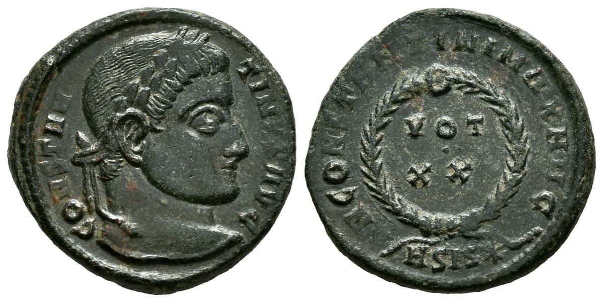 CONSTANTINO I. Follis. (Ae. 3,35g/19mm). 320-321 d.C. Siscia. (RIC 159). Anv: Cabeza laureada de Constantino II a derecha, alrededor leyenda: CONSTANTINVS AVG. Rev: Leyenda: VOT/XX, dentro de corona de laurel, debajo: ASIS-estrella, alrededor leyenda: D N CONSTANTINI MAX AVG. EBC.
