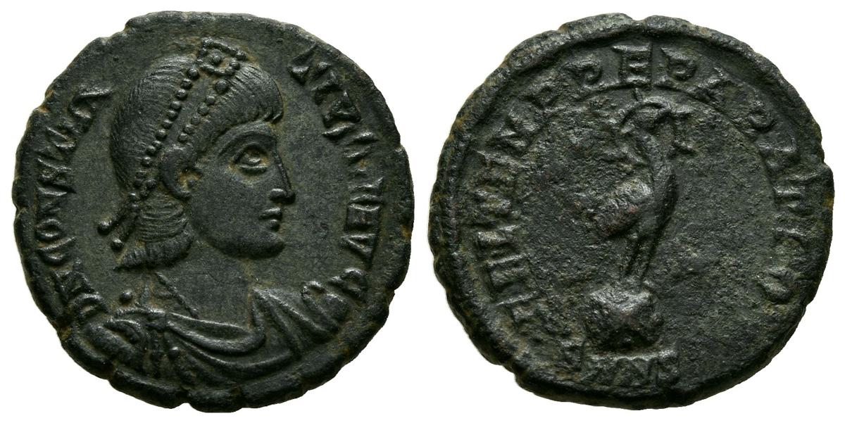 CONSTANCIO II. Follis. (Ae. 3,48g/18mm). 347-348 d.C. Antioquía. (RIC 129). Anv: Busto diademado, drapeado y con coraza de Constancio II a derecha, alrededor leyenda: D N CONSTANTIVS P F AVG. Rev: Fénix estante a derecha con corona radiada sobre globo, en campo estrella, alrededor leyenda: FEL TEMP REPARATIO. MBC+/MBC.