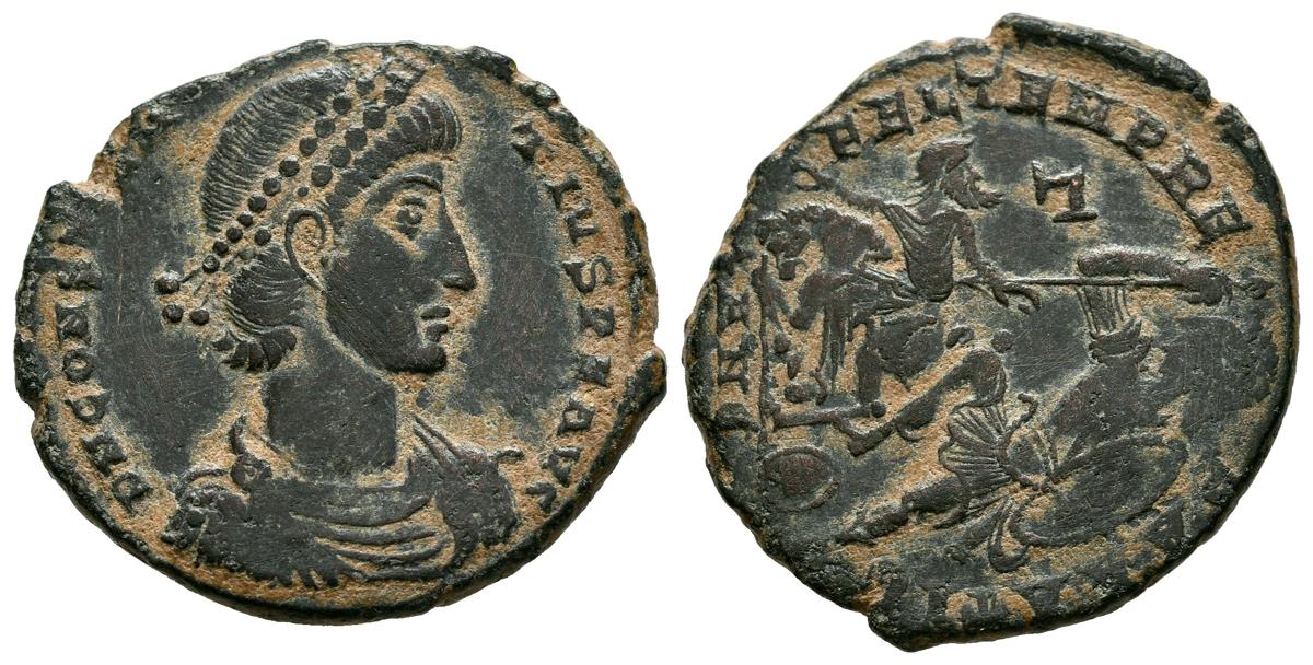 CONSTANCIO II. Follis. (Ae. 5,30g/23mm). 350-355 d.C. Antioquía. (RIC 132). Anv: Busto diademado y drapeado de Constancio II a derecha, alrededor leyenda: DN CONSTANTIVS P F AVG. Rev: Soldado con lanza y escudo atacando a jinete caído, en campo r, en exergo: ANE, alrededor leyenda: FEL TEMP REPARATIO. MBC-.