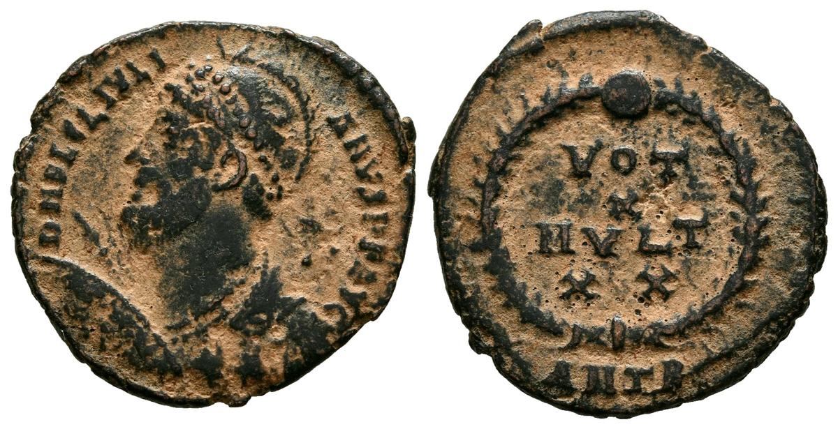 JULIANO II. Follis. (Ae. 2,50g/19mm). 361-363 d.C. Antioquía. (RIC 220). Anv: Busto con casco y coraza portando lanza y escudo, alrededor leyenda: D N FL CL IVLIANVS P F AVG. Rev: Láurea, dentro leyenda: VOT X MVLT XX, debajo leyenda: ANTB. MBC.
