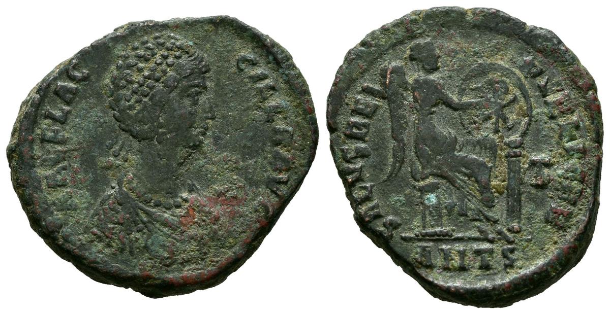 AELIA FLACILLA. Maiorina. (Ae. 5,88g/24mm). 379-383 d.C. Antioquía. (RIC 43). Anv: Busto diademado, drapeado y con coraza de Aelia Flacilla a derecha, alrededor leyenda: AEL FLACCILLA AVG. Rev: Salus sentada sobre columna a derecha portando escudo con monograma sobre columan, delante T, en exergo: ANTS, alrededor leyenda: SALVS REI PVBLICAE. MBC-.
