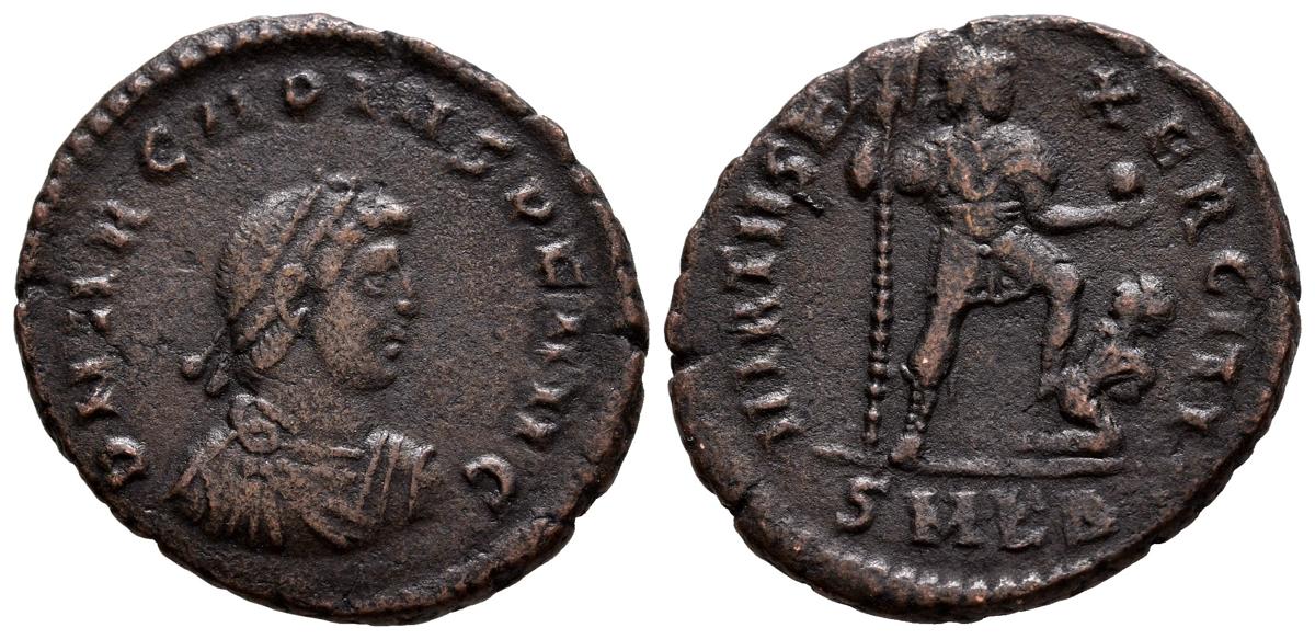 ARCADIO. Follis. (Ae. 4,88g/23mm). 378-383 d.C. Cícico. (RIC 25c). Anv: Busto diademado, drapeado y con coraza de Arcadio a derecha, alrededor leyenda: D N ARCADIVS P F AVG. Rev: Arcadio estante a derecha portando labarum y globo con pie sobre cautivo, en exergo: SMKA, alrededor leyenda: VIRTVS EXERCITI. MBC-.