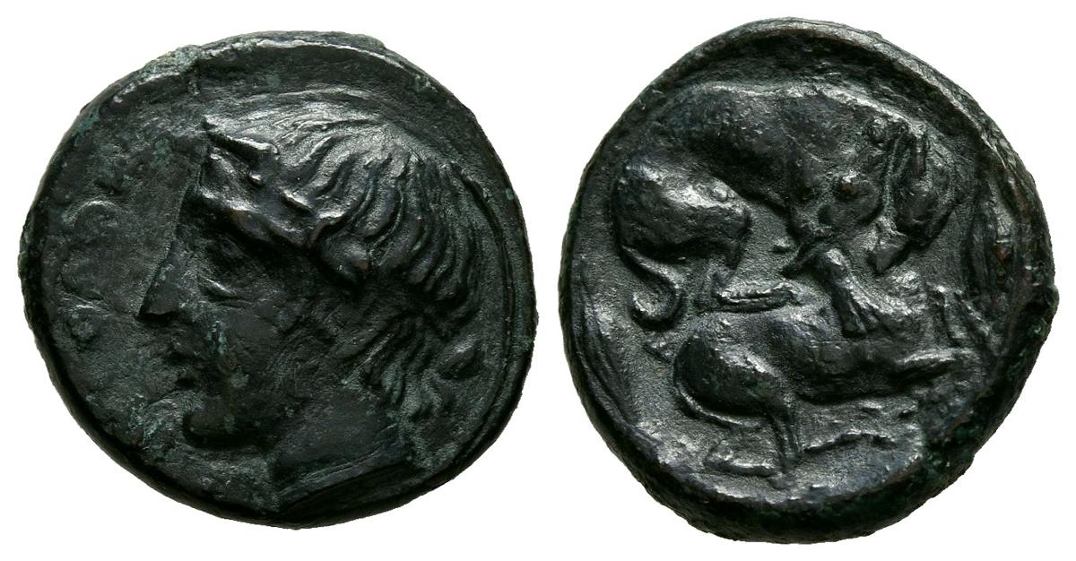 SICILIA, Piacus. Hemilitra. (Ae. 1,93g/14mm). 420-410 a.C. (AMB 396; Calciati III-1). Anv: Cabeza laureada del dios Symaithos a izquierda, delante leyenda griega. Rev: Perro atacando a un ciervo, a la izquierda bellota, a la derecha palma. EBC-. Precioso ejemplar, raro y más así.