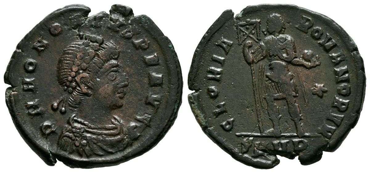 HONORIO. Maiorina (Ae. 4,45g/23mm). 392-395 d.C. Heráclea. (RIC 27c). Anv: Busto diademado de Honorio a derecha, alrededor leyenda: D N HONORIVS P F AVG. Rev: Honorio sosteniendo vexillum y globo, detrás estrella, en exergo: SMHB, alrededor leyenda: GLORIA ROMANORVM. MBC.