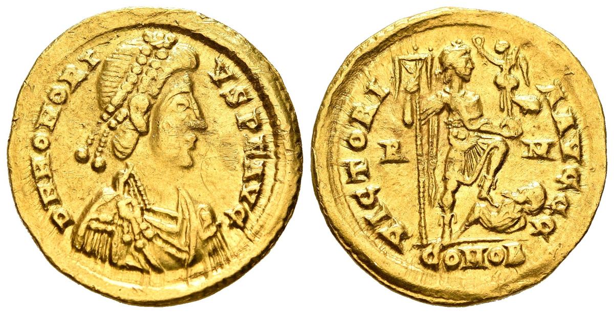 HONORIO. Sólido. (Au. 4,42g/21mm). 395-423 d.C. Constantinopla. (RIC X 1352, catalogado como R4; Cohen 44). Anv: Busto diademado, drapeado y con coraza de Honorio a derecha, alrededor leyenda: DN HONORIVS PF AVG. Rev: Honorio estante a derecha con pie sobre cautivo portando estandarte y Victoria con corona de laurel, entre R-M, en exergo: CONOB, alrededor leyenda: VICTORIA AVGGG. MBC+. Escaso ejemplar.