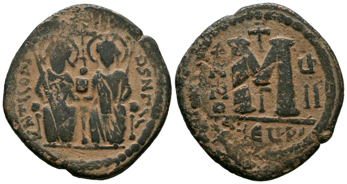 JUSTINO II y SOFIA. Follis. (Ae. 12,18g/33mm). 565-578 d.C Antioquía. (Seaby 379). Anv: Justino II y Sofia sentados de frente coronados y con cetro, alrededor leyenda. Rev: M grande, encima cruz, debajo r, a ambos lados: ANNO-G/II, en exergo: THEUP. MBC-.