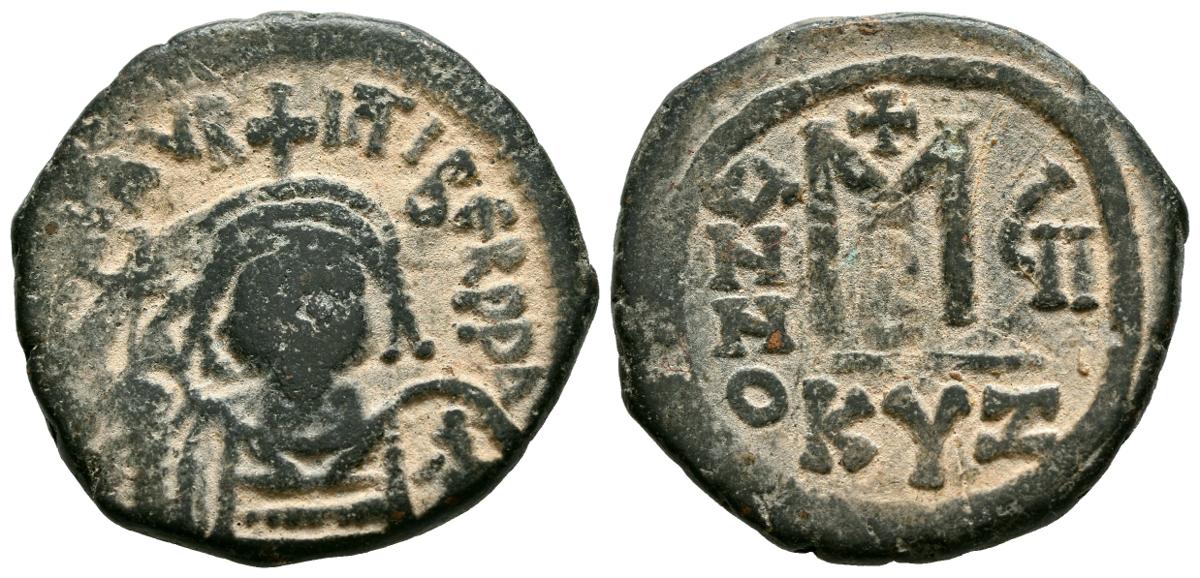 MAURICIO TIBERIO. 40 Nummi. (Ae. 10,16g/26mm). 588-589 d.C. Cícico. (Seaby 518). Anv: Busto con casco y coraza de frente portando globo y escudo, alrededor leyenda. Rev: M grande, debajo B, encima cruz, a la izquierda leyenda: ANNO, a la derecha: ÇI y en exergo: KYZ. MBC-.