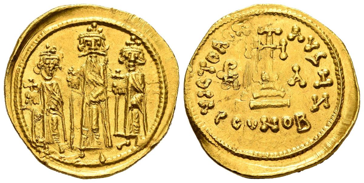 HERACLIO. Sólido. (Au. 4,45g/21mm). 638-641 d.C. Constantinopla. (Seaby 764). Anv: Heraclonas, Heraclio y Heraclio Constantino estantes de frente portando globo. Rev: Cruz patada sobre tres escalones, entre dos monogramas, alrededor leyenda: VICTORIA AVG H N. EBC-. Rozadura en reverso.