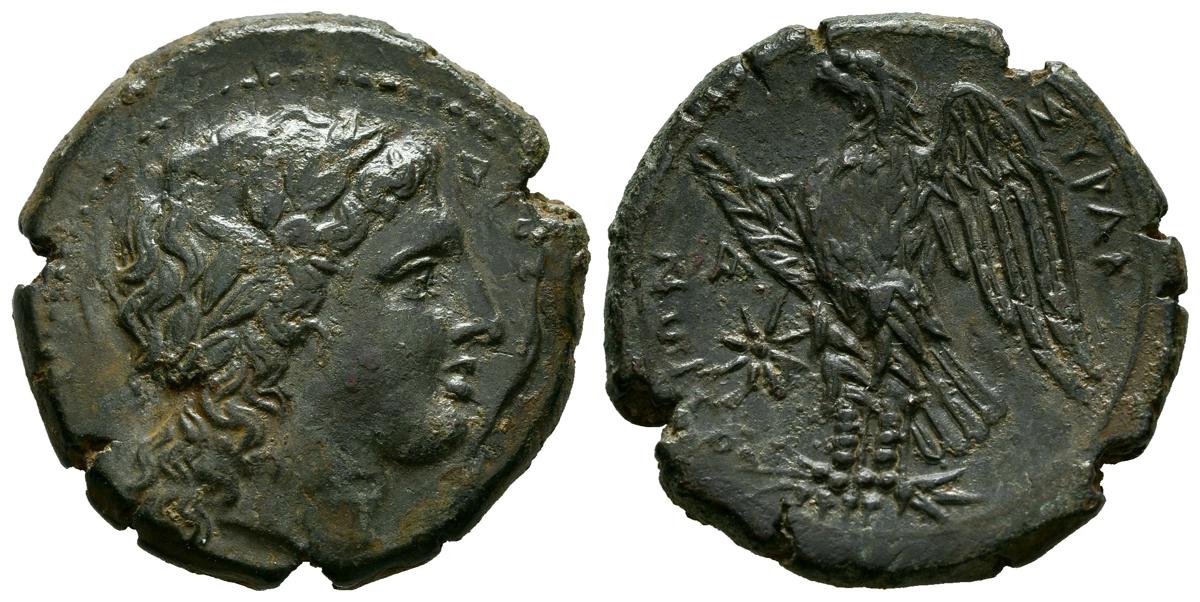 SICILIA, Siracusa. Ae23. (Ae. 9,14g/23mm). Hiketas. 287-278 a.C. (SNG Ans 803; SNG Copenhagen 789). Anv: Cabeza laureada de Apolo a derecha, delante leyenda griega. Rev: Aguila estante a izquierda sobre fulmen, delante estrella, entre leyenda griega. EBC. Escaso ejemplar y más así.
