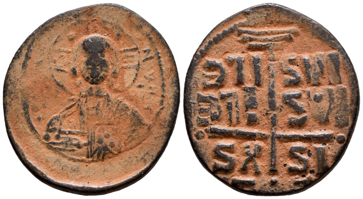 ANONIMO, a nombre de Romanus III. Follis. (Ae. 12,92g/34mm). 1028-1034 d.C. (Seaby 1823). Anv: Busto de cristo de frente con mano alzada y portando evangelio. Rev: Leyenda dentro de cruz. MBC-.