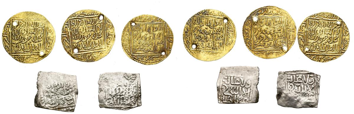 REINO DE GRANADA. Lote de 5 monedas, 2 en plata del Reino de Granada del tipo Vives 2193 e incluye 3 monedas de oro todas con perforaciones, posiblemente amuletos o piezas de imitación de dinares almohades o hafsies. A EXAMINAR.