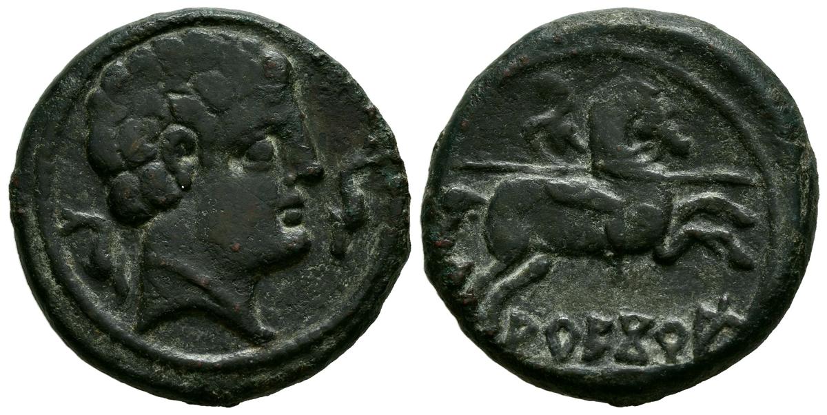 ARECORATAS (Agreda, Soria). As. (Ae. 11,72g/24mm). 150-20 a.C. (FAB-116). Anv: Cabeza masculina a derecha, entre dos delfines. Rev: Jinete con lanza a derecha, debajo leyenda ibérica: ARECoATaS. MBC+.