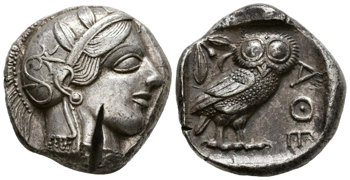 ATTICA, Atenas. Tetradracma. (Ar. 17,16g/23mm). 454-404 a.C. (SNG Copenhagen 31). Anv: Cabeza de Atenas con casco ático con cresta a derecha. Rev: Búho estante a derecha mirando de frente, delante: AOE, detrás rama de olivo. MBC+. Golpe de cizalla en anverso.