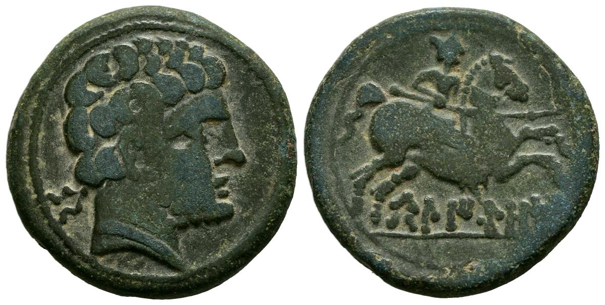 BELIGIOM (Belchite, Zaragoza). As. (Ae. 11,30g/25mm). 120-20 a.C. (FAB-243). Anv: Cabeza masculina barbada a derecha, detrás letra ibérica: Be. Rev: Jinete con lanza a derecha, debajo leyenda ibérica: BeLIGiOM. MBC. Pátina verde.