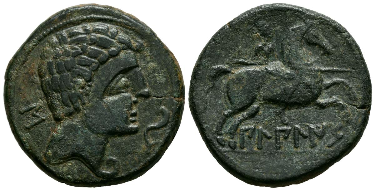 BILBILIS (Calatayud, Zaragoza). As. (Ae. 15,04g/28mm). 120-30 a.C. (FAB-254). Anv: Cabeza masculina a derecha, detrás letra S, delante delfín. Rev: Jinete con lanza a derecha, debajo leyenda ibérica sobre línea: BILBILIS. MBC+. Pátina verde.