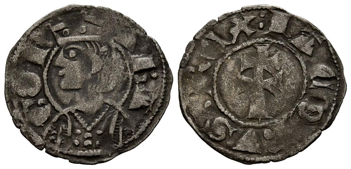 JAIME II (1297-1327). Dinero. (Ve. 0,86g/19mm). Aragón. (Cru.V.S 364). Anv: Busto coronado de Jaime II a izquierda dentro de grafila, alrededor leyenda: ARAGON. Rev: Cruz patriarcal dentro de gráfila, alrededor leyenda: IACOBVS REX. MBC-.