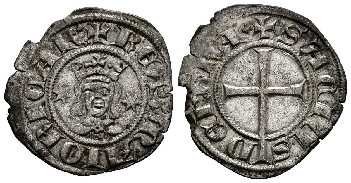 SANCHO I (1311-1324). Dobler (Ve. 1,61g/21mm). Mallorca. (Cru V.S. 547). Anv: Busto de Sancho I de frente coronado entre estrellas, alrededor leyenda: REX MAIORICAR. Rev: Cruz latina, alrededor leyenda: SACIVS DEI GRA. EBC-. Cospel ligeramente faltado.