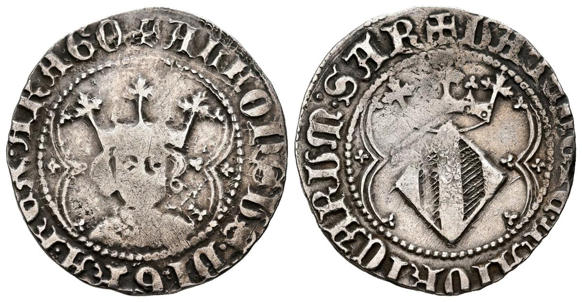 ALFONSO IV (1327-1336). 1 Real. (Ar. 3,29g/23mm). Valencia. (Cru VS 864.2). Anv: Efigie coronada de frente de Alfonso IV, alrededor leyenda: ALFONSVS DI GRA REX ARAGO. Rev: Armas valencianas coronadas, alrededor leyenda: VALENCIE MAIORICARVM SAR. MBC-. Escasa.